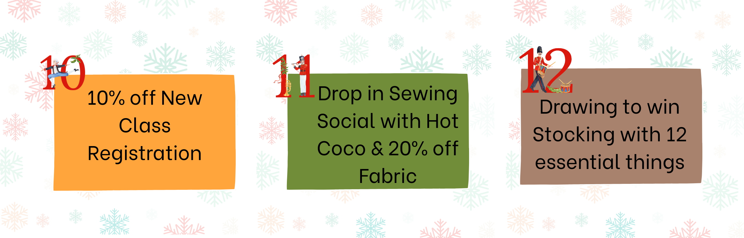 Day 11: Eleven Pipers Piping - Pop in, sew sip and celebrate the season with us. Enjoy 20% off Micheal Miller Fabric, Drop in between 10:30 - 12:30 pm hand sew a christmas ornament.